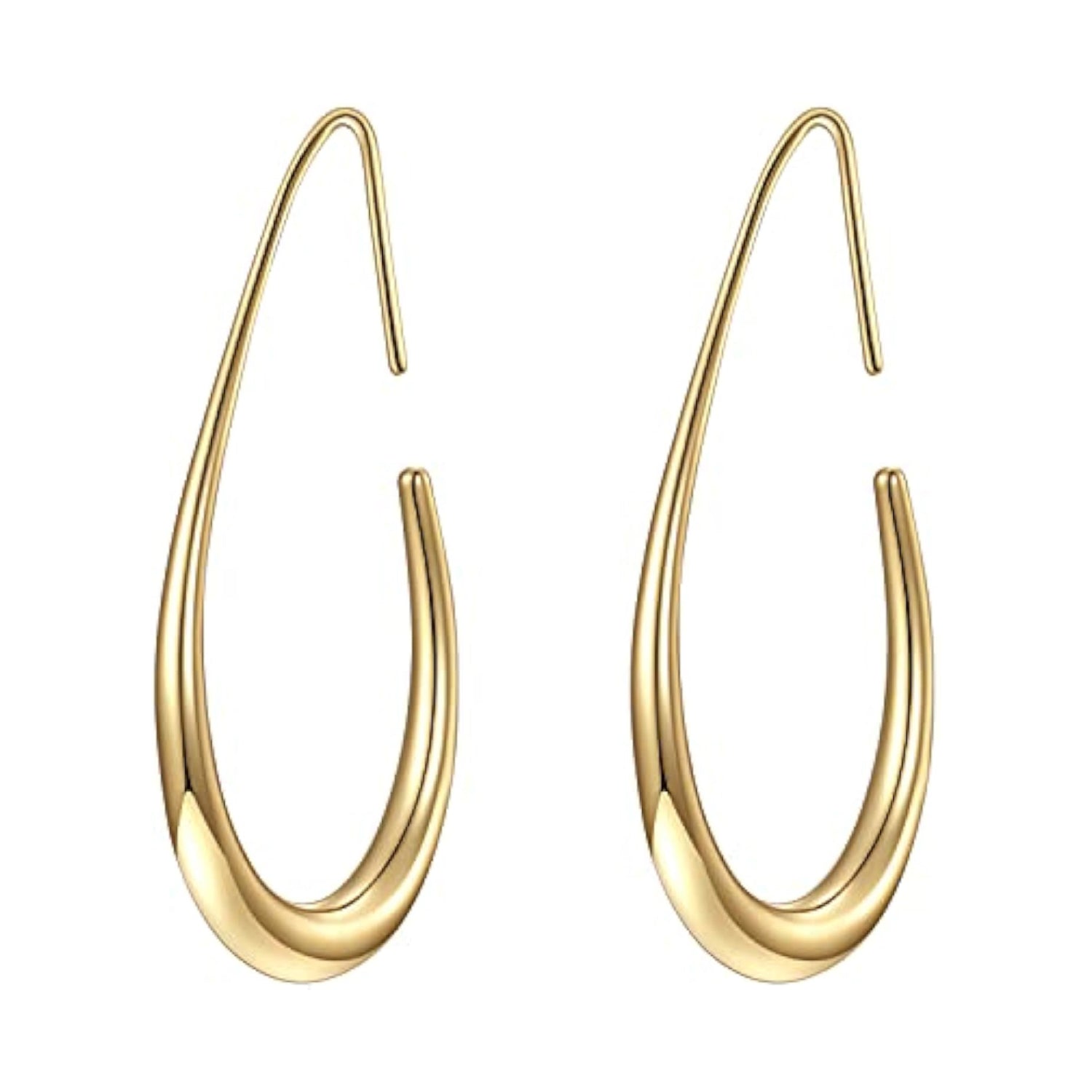 Lightweight Teardrop Hoop Earrings for Women - 14k Gold/White Gold Plated Large Oval Pull Through Hoop Earrings High Polished Statement Jewelry Gift for Women